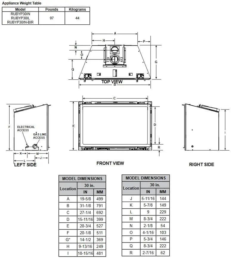 | Minimum Firebox Opening Front Width: | 31-5/8″ |