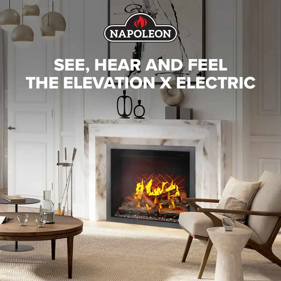 the fireplace with the touch screen panel, premium handheld remote, the Napoleon Home app, or voice commands through Google Home or Alexa. The Elevation X is a convenient way to enjoy a fire especially in places where traditional gas and wood fireplaces are not feasible. Napoleon’s Elevation X electric fireplace is in a class of its own. It’s the Power of Fire.
